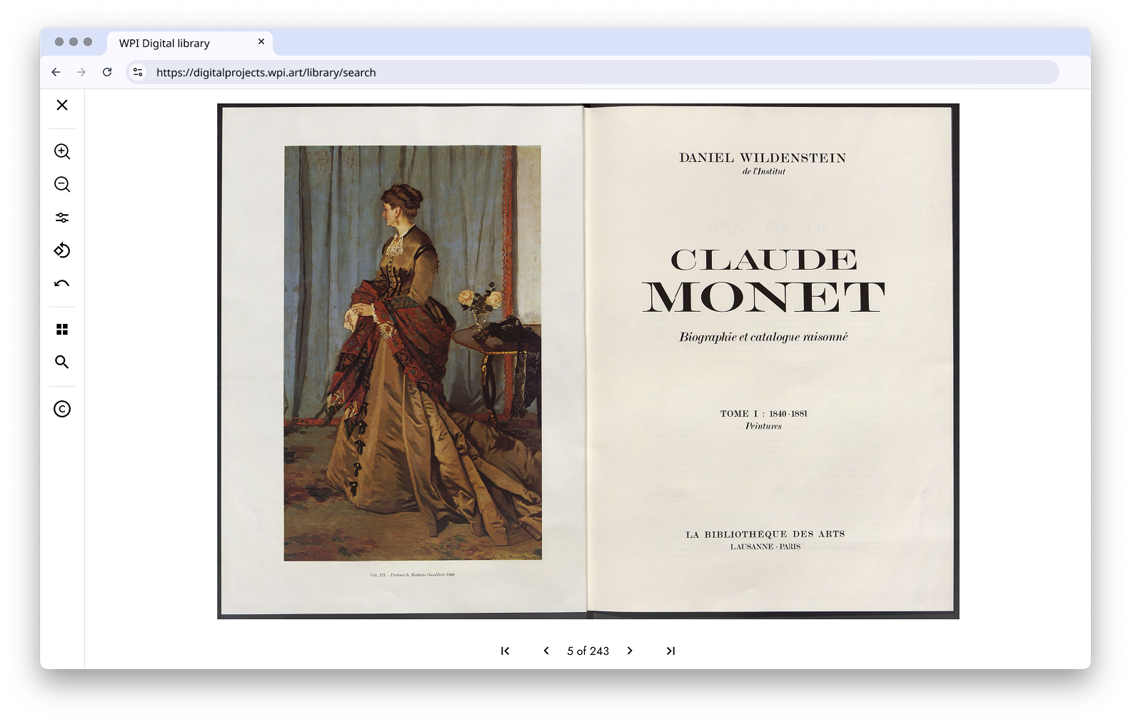 The WPI Digital Library advances scholarly access to art historical resources. Launching with over 25,000 scanned publications, this new platform consolidates the Wildenstein Plattner Institute's extensive collection of sales catalogues, exhibition catalogues, and catalogues raisonnés into a single, searchable location. Navigating.art designed the Digital Library technology with two primary values in mind: usability and findability. By integrating enhanced search capabilities with an intuitive design, the Digital Library addresses researchers' needs while opening new avenues for discovering connections across the art market and exhibition histories.